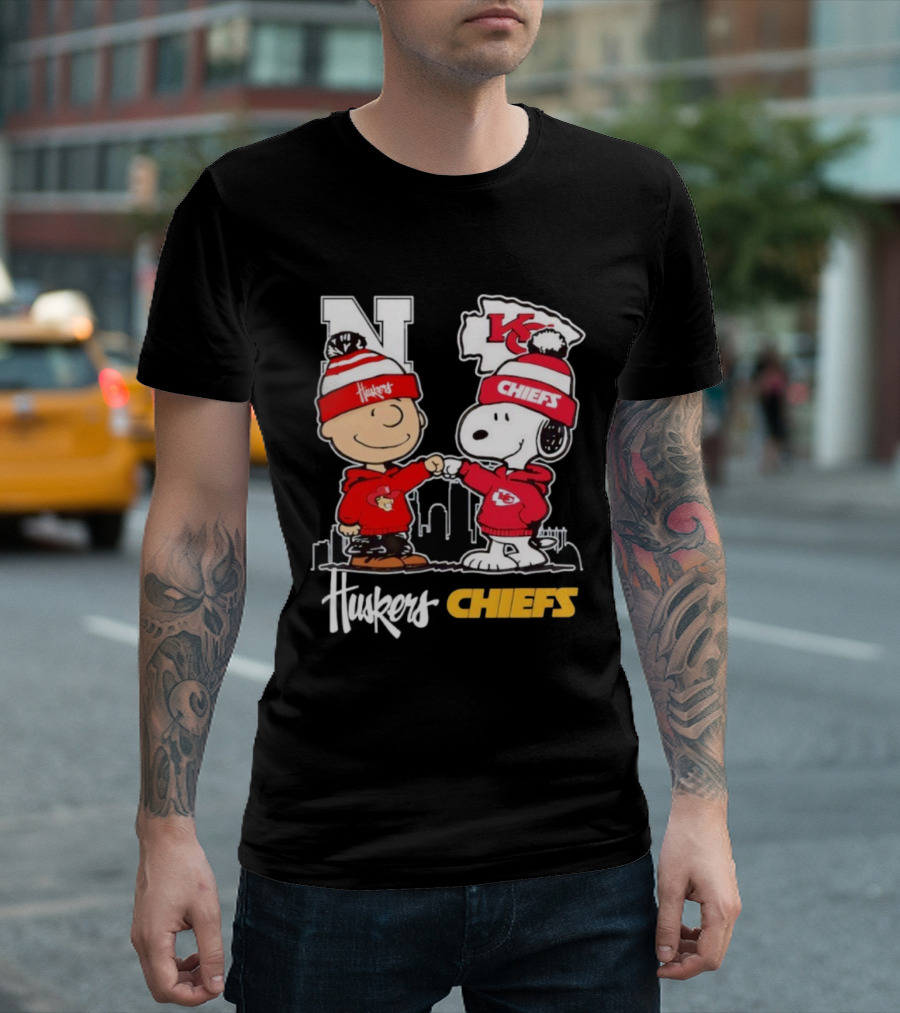 Charlie Brown Snoopy Nebraska Cornhuskers Kansas City Chiefs Husker Chiefs Team Spirit Icons T-shirt — on-model street pose, front view.