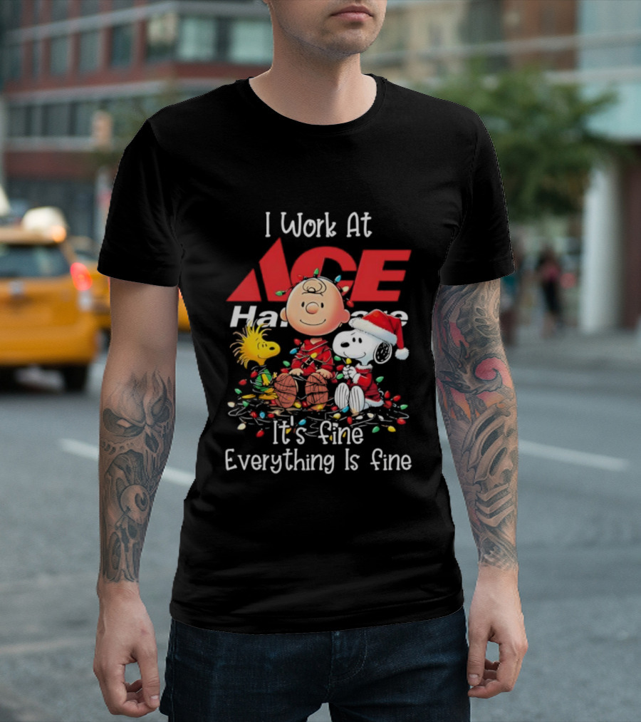 Peanuts Characters Christmas Lights I Work At Ace Hardware It's Fine Everything Is Fine T-Shirt