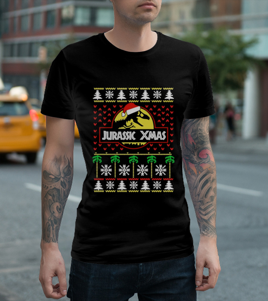 Jurassic Xmas Santa Hat Ugly Christmas Sweater Style T-Shirt