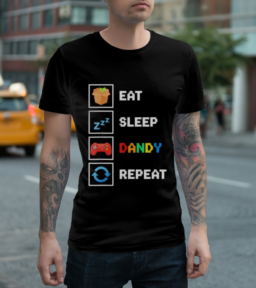 Eat Sleep Dandy Repeat Pixel Foodie Retro Gamer Pattern T-shirt — on-model street pose, front view.