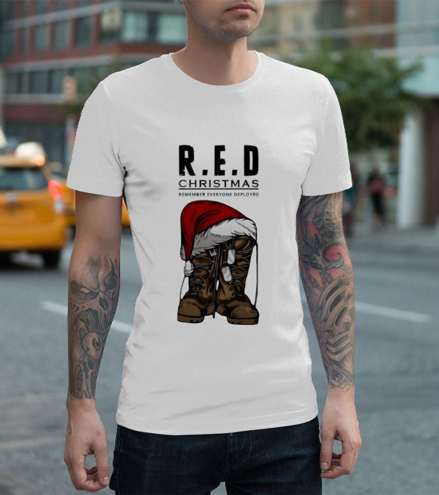 Red Christmas Santa Hat Boots Remember Everyone Deployed T-Shirt