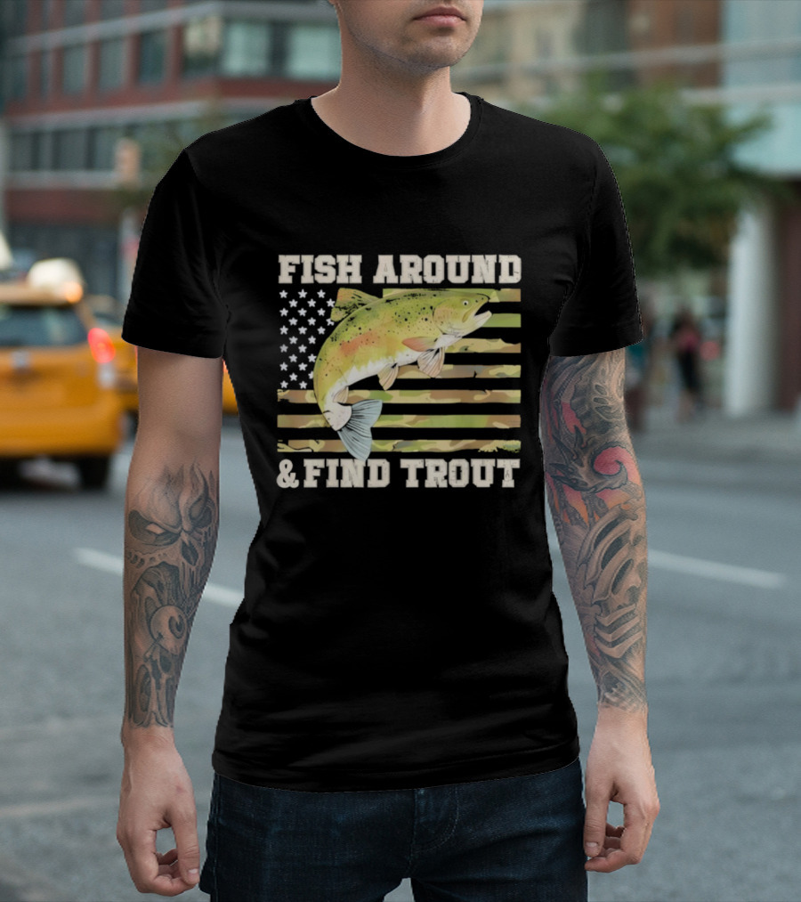 Fish Around And Find Trout With American Flag Fishing Humor T-Shirt