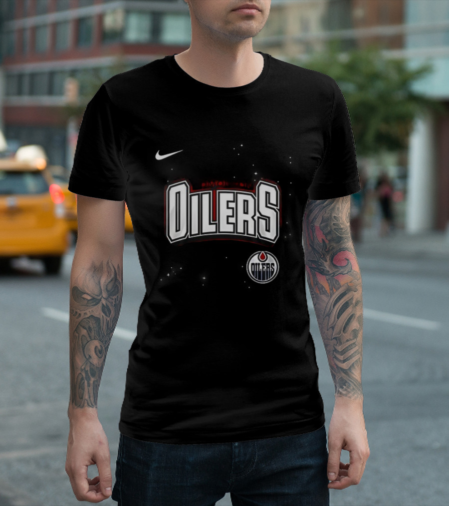 Edmonton Oilers x Iconic Co Headlining finger eleven headstones The Tea Party Graphic Tee — on-model night pose, front view.