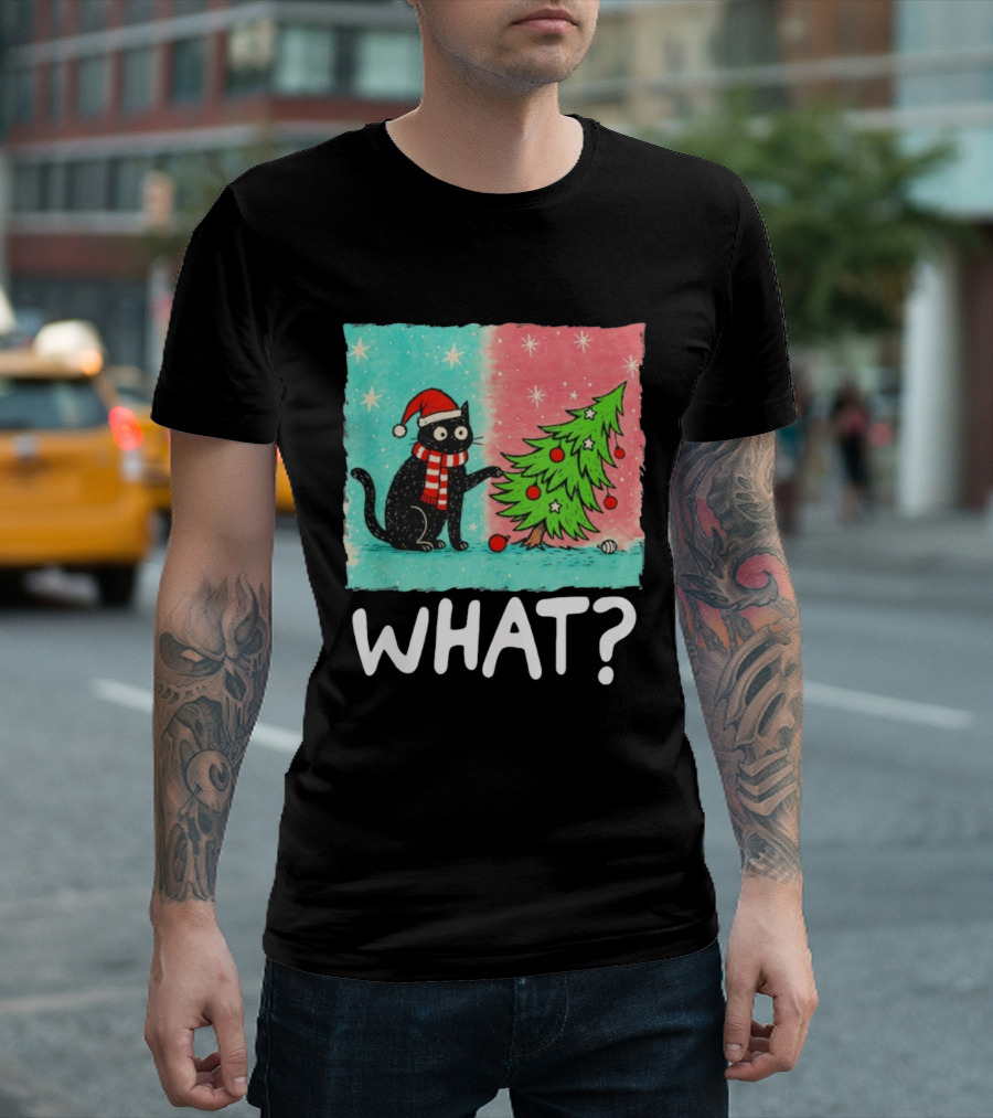 Black Cat Santa Hat Pushing Christmas Tree What T-Shirt