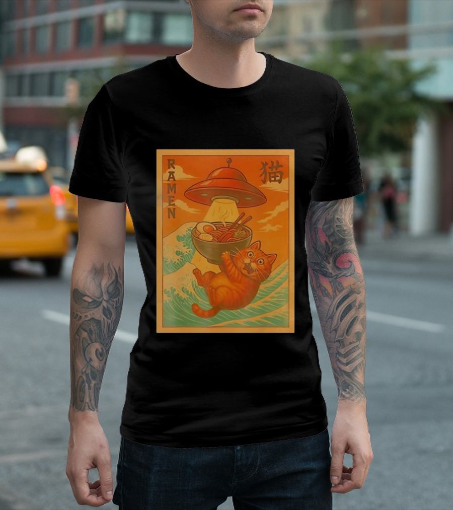 Ramen Cat UFO Funny Japanese Anime Retro Wave Scene T-Shirt