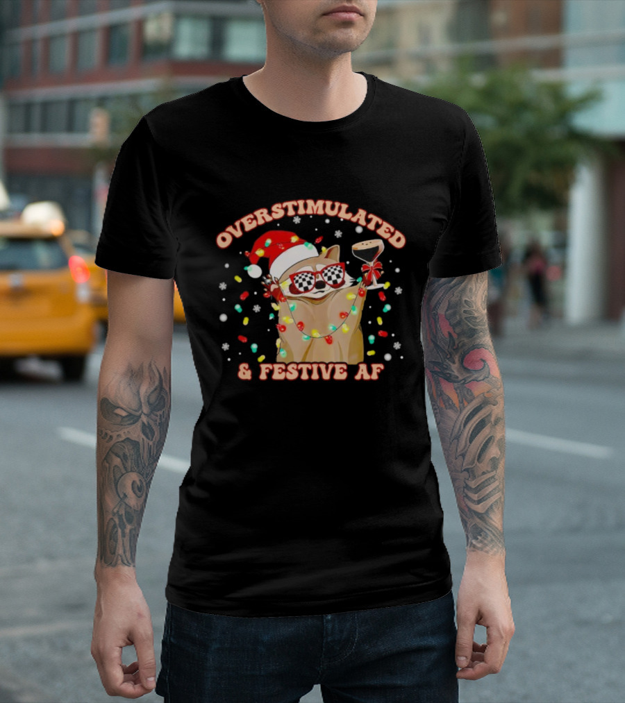 Overstimulated Raccoon Santa Hat And Festive Lights Holding Holiday Drink T-Shirt