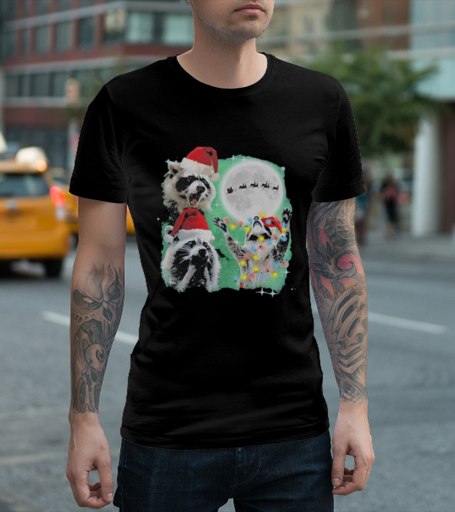 Three Raccoons Santa Hats Christmas Moon Lights Sleigh T-Shirt
