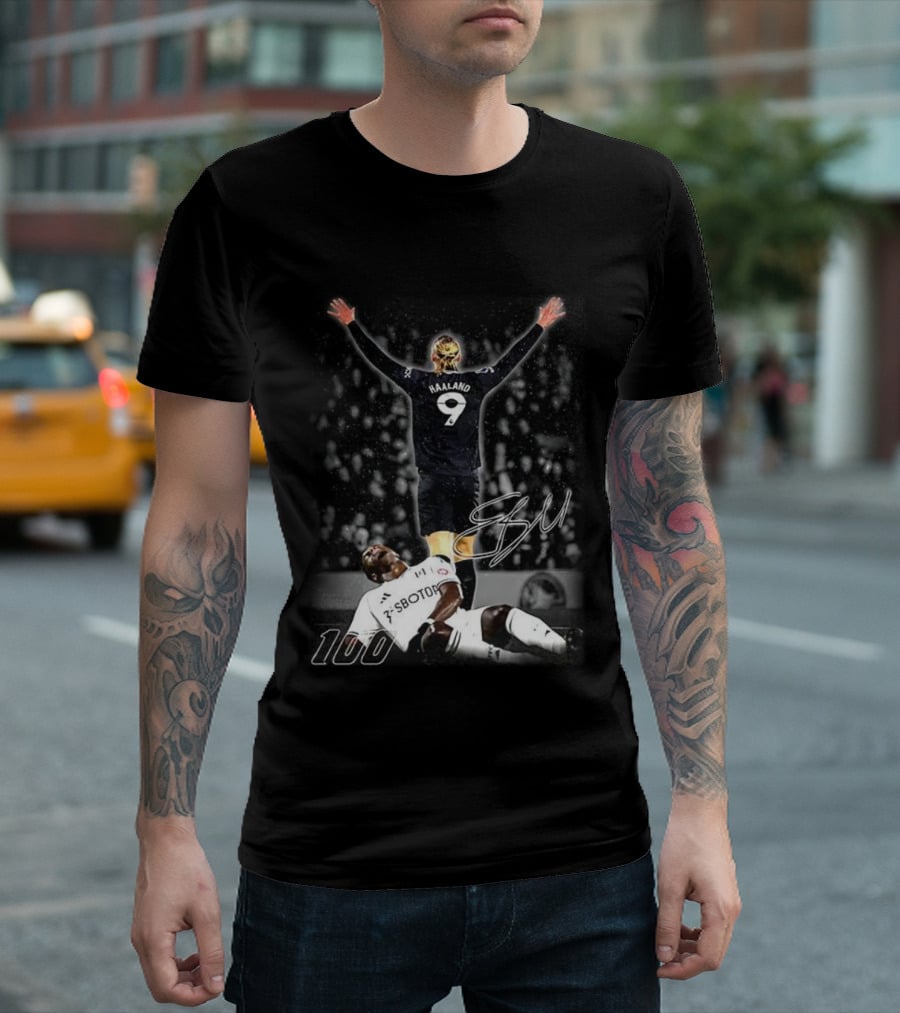 Erling Haaland 9 Manchester City 100th Goal Celebration Signature T-Shirt