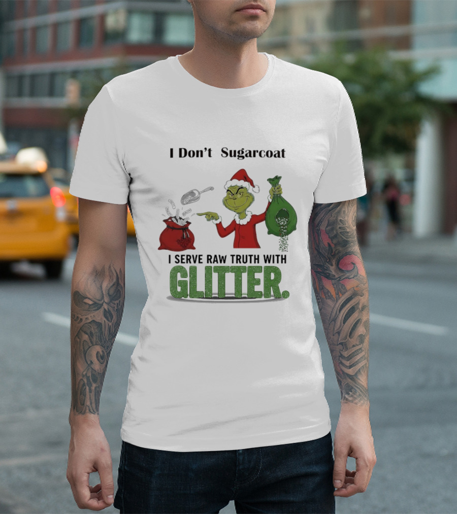 Grinch Santa I Don't Sugarcoat I Serve Raw Truth With Glitter T-Shirt