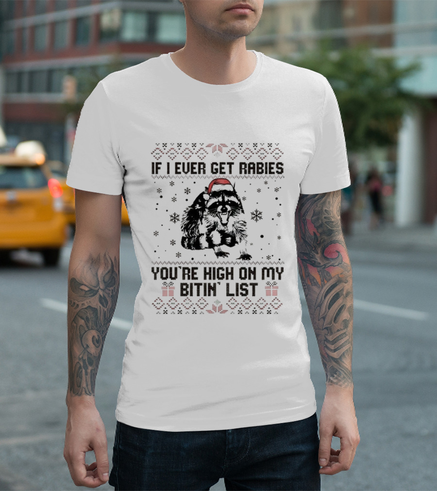Raccoon If I Ever Get Rabies You're High On My Bitin' List Ugly Christmas Sweater Santa Hat Snowflakes Present T-Shirt