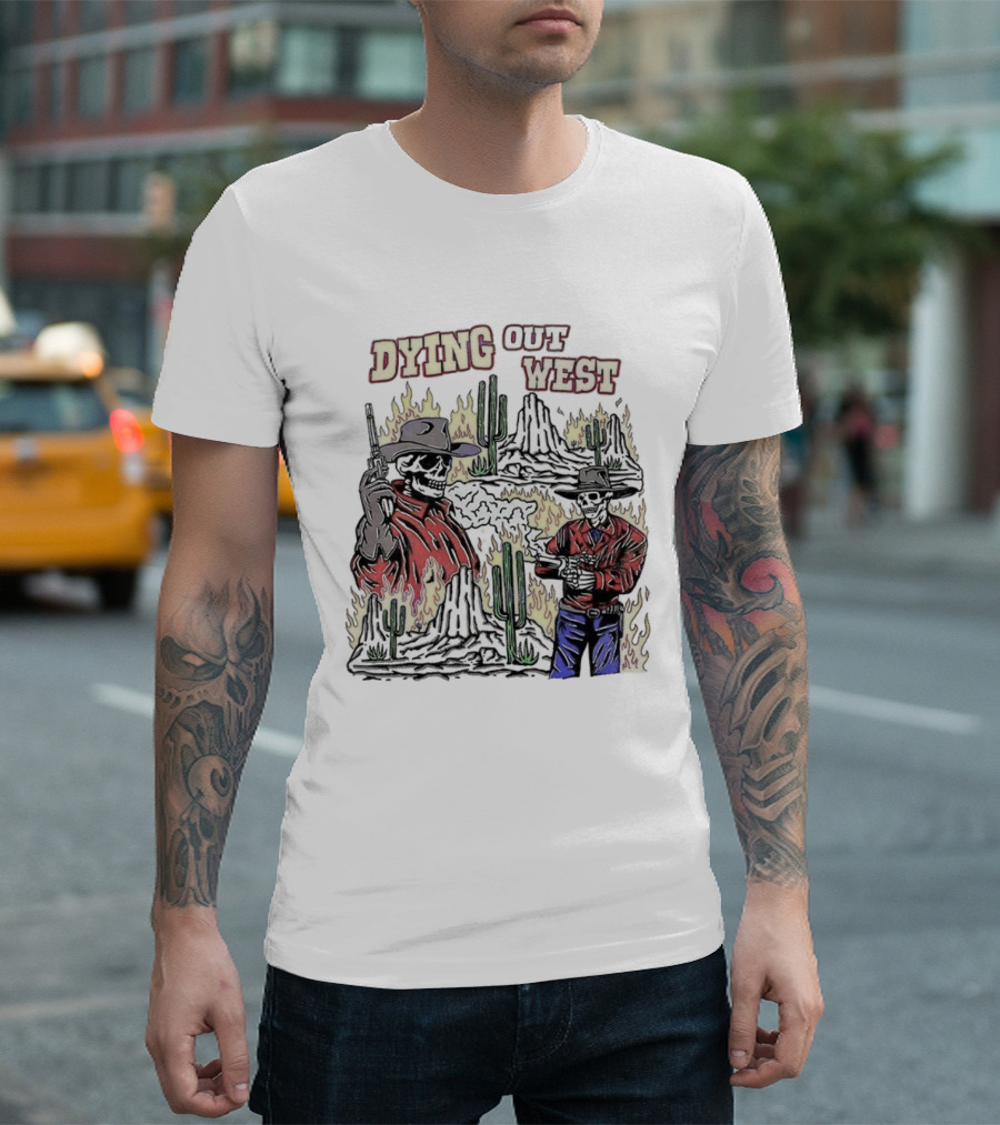 Dying Out West Cowboy Skeleton Cactus Flames Scenic T-Shirt