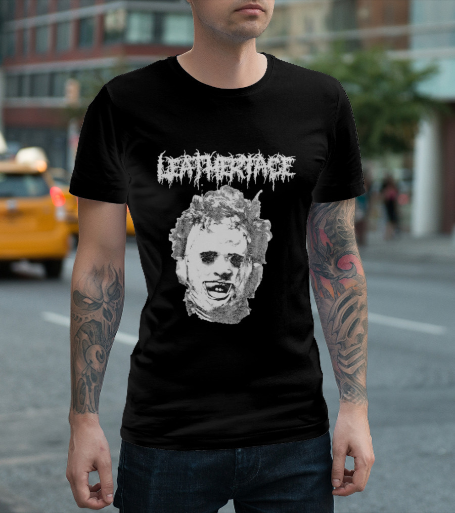 The Texas Chainsaw Massacre Metal Face Horror Icon Classic Tee — on-model night pose, front view.