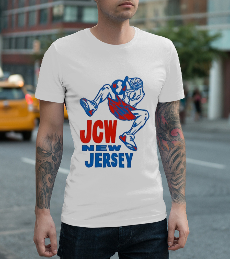 JCW New Jersey Basketball Dunking Figure Iconic Sports Style T-shirt — on-model street pose, front view.