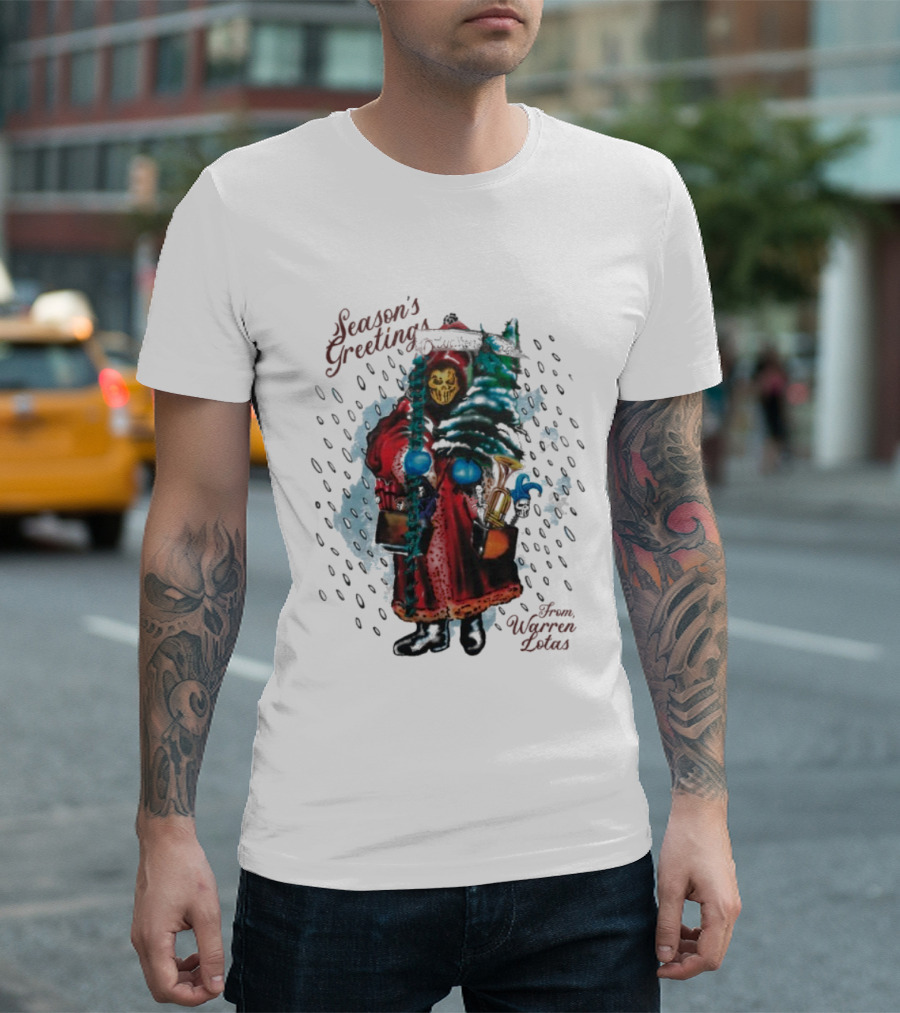 Season's Greetings From Warren Lotas Christmas Skeleton In Santa Robe T-Shirt