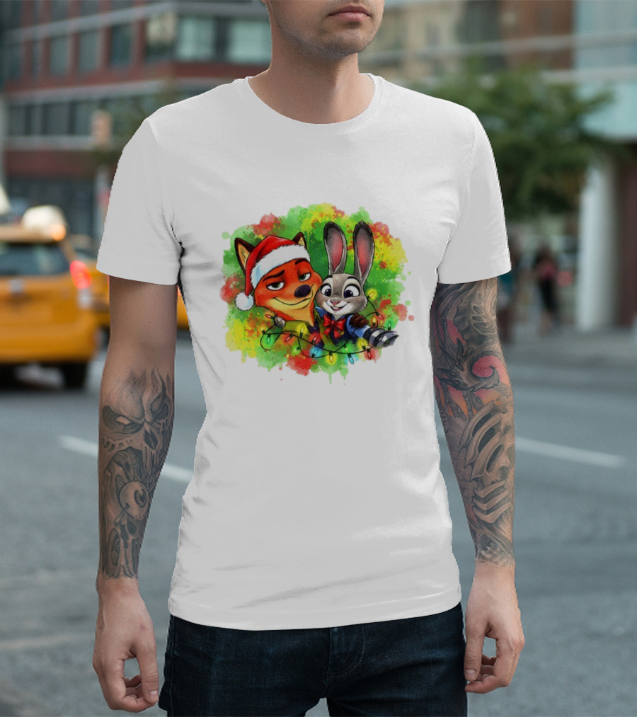Couple Fox And Bunny Zootopia 2 Santa Hat Merry Christmas Holiday Lights T-Shirt