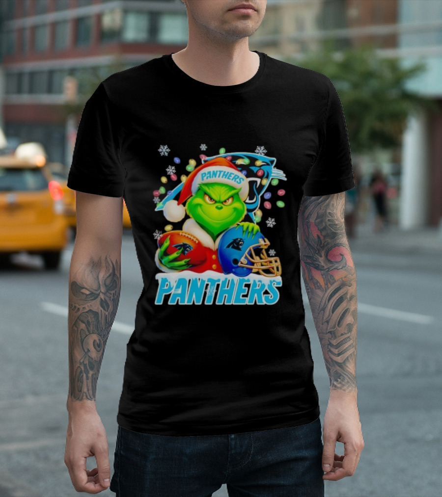 Grinch Santa Hat Holding Carolina Panthers Football And Helmet Merry Christmas T-Shirt