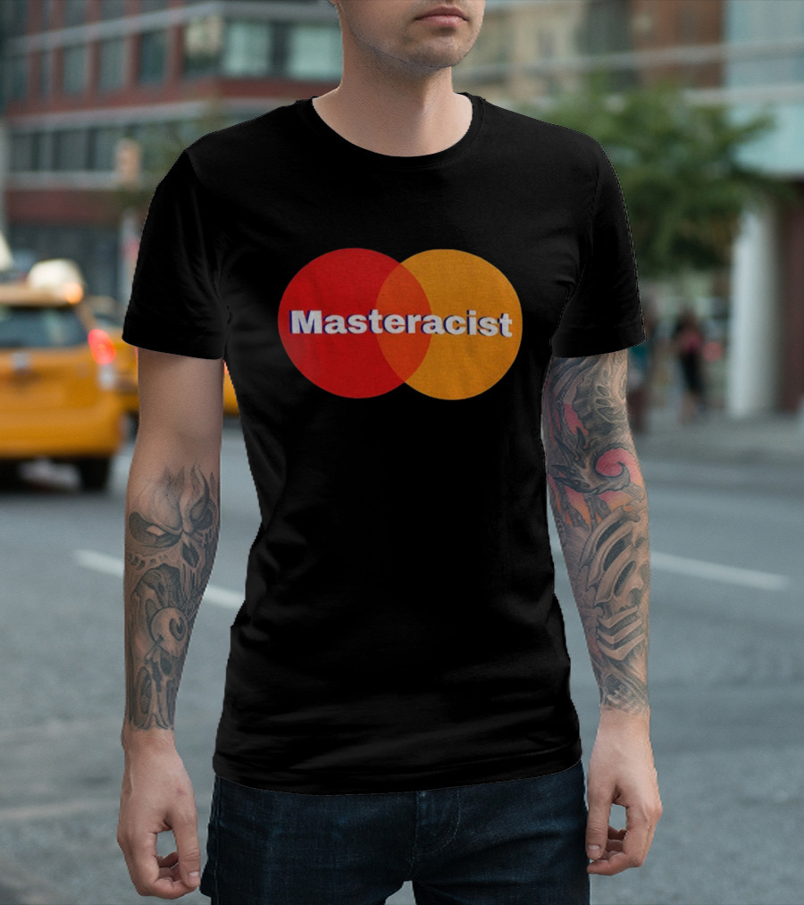 Masterracist Mastercard Parody Iconic Red Orange Overlapping Circles T-shirt — on-model street pose, front view.