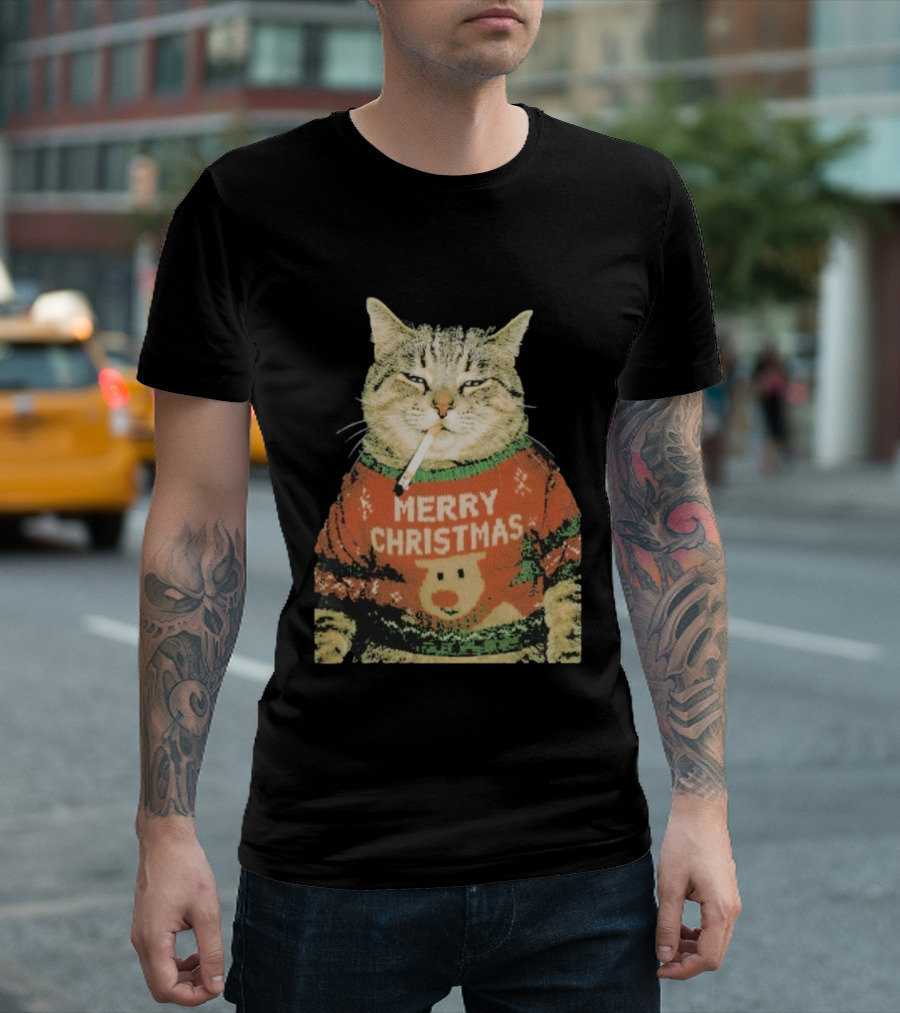 Merry Christmas Cat Sweater Smoking Cat Holiday Bear T-Shirt