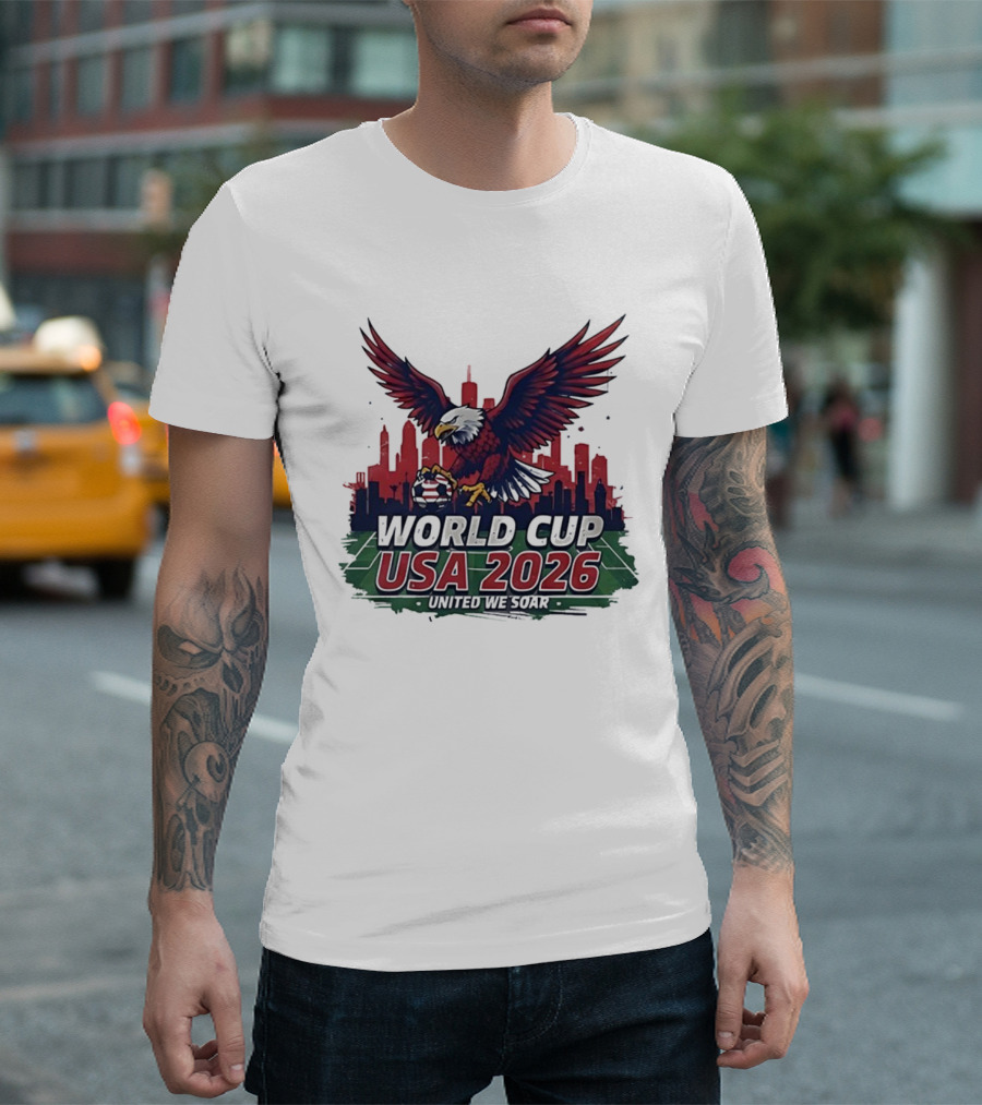 World Cup USA 2026 Bald Eagle United We Soar City Skyline Football Field T-Shirt