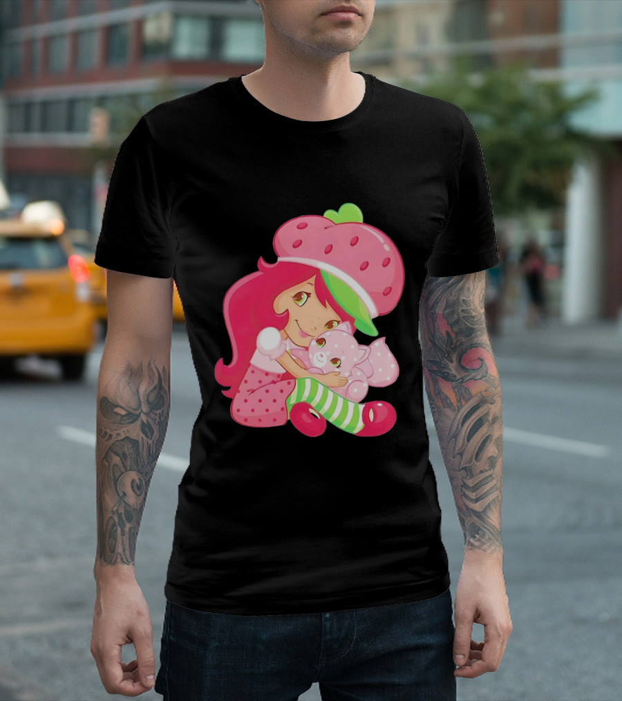 Strawberry Girl Hugging Pink Cat With Hat And Polka Dot Pants T-Shirt