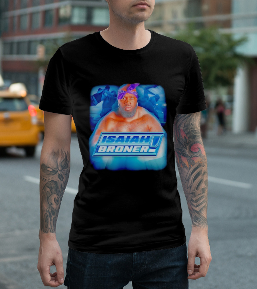 Isaiah Broner Iconic Blue Bandana Style Power Pose T-shirt — on-model standing pose, front view.