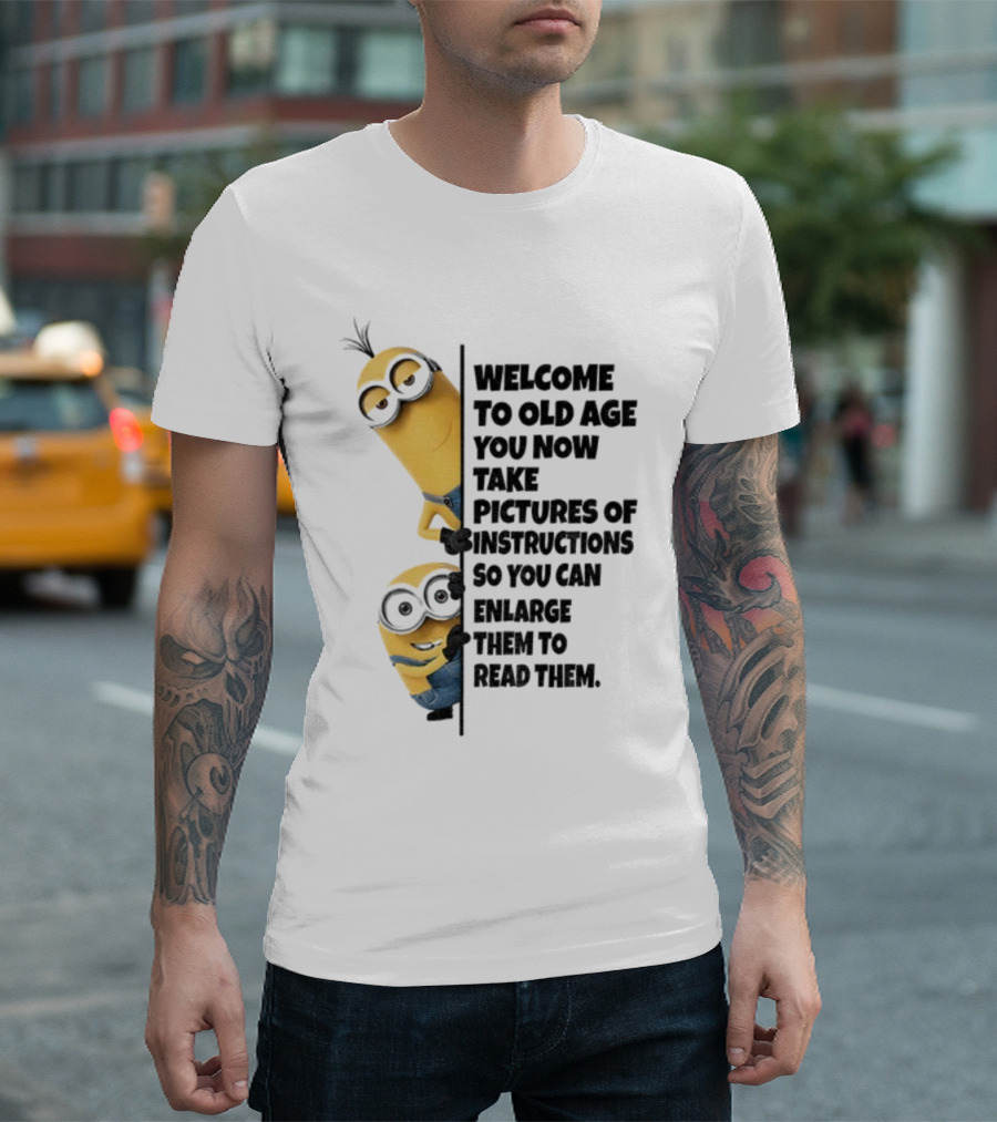 Welcome To Old Age You Now Take Pictures Of Instructions So You Can Enlarge Them To Read Them Minion T-Shirt