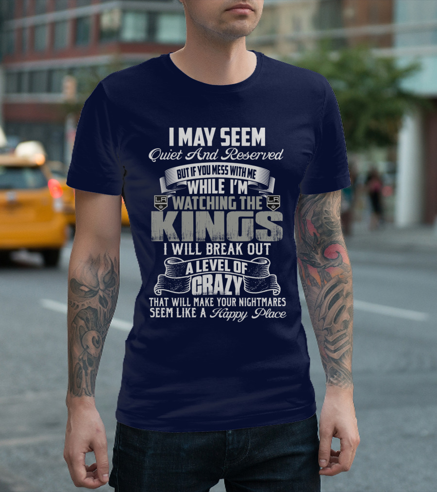 I May Seem Quiet And Reserved But If You Mess With Me While I'm Watching The Los Angeles Kings I Will Break Out A Level Of Crazy That Will Make Your Nightmares Seem Like A Happy Place T-shirt — on-model street pose, front view.