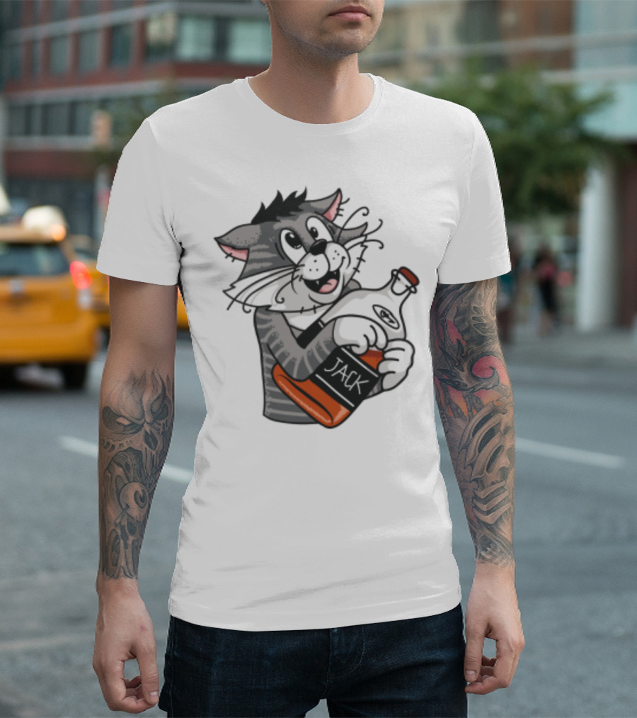 Jack Whiskey Cat Hugging Bottle Playful Striped Kitty Character T-Shirt
