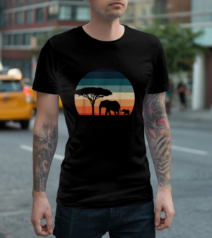 Elephant And Acacia Tree Silhouette Against Striped Vintage Sunset T-Shirt