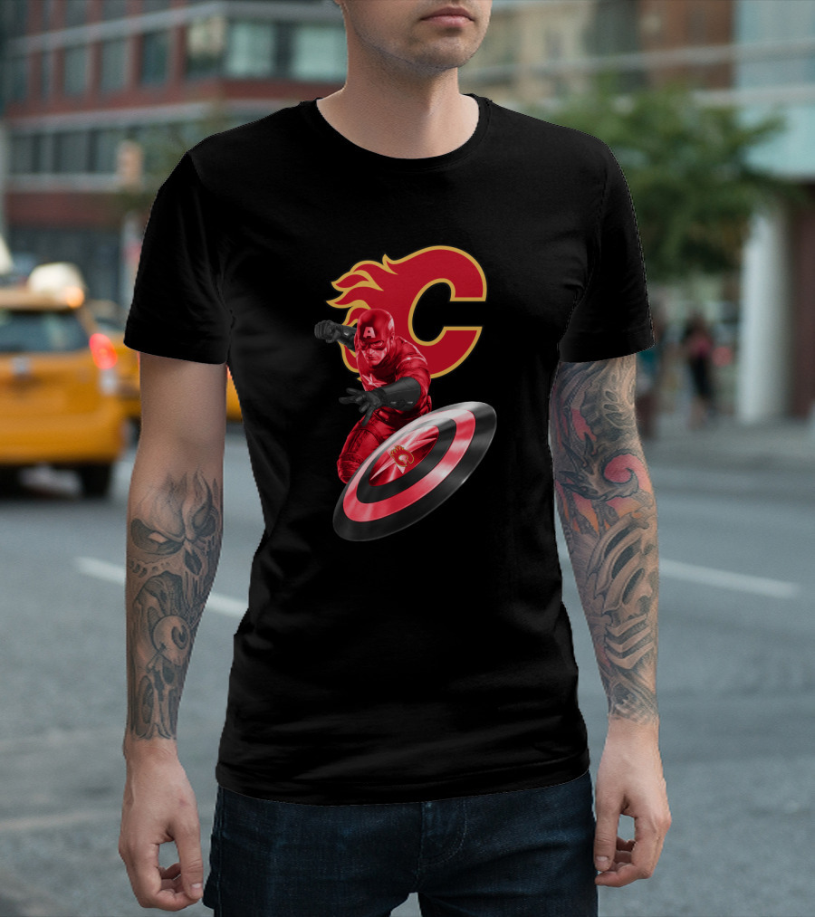 Calgary Flames And Captain America Shield Fusion Marvel Fans T-Shirt