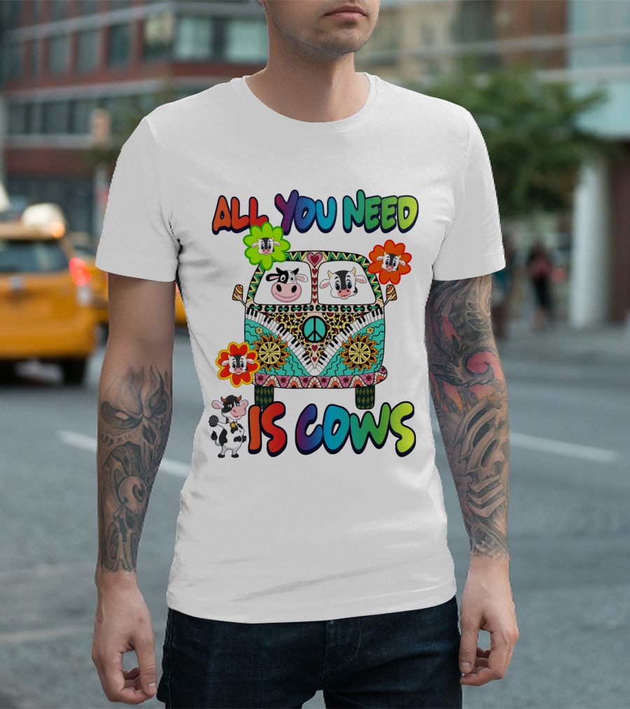 All You Need Is Cows Peace Van With Colorful Flowers And Cow Faces T-Shirt