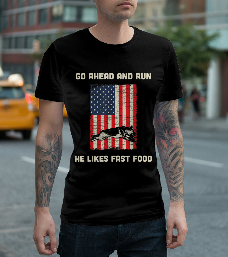 Go Ahead And Run He Likes Fast Food American Flag K9 Unit T-Shirt
