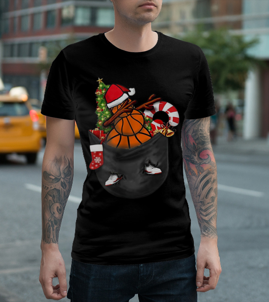 Dabbing Snowman Basketball Santa Hat Christmas Pocket T-Shirt
