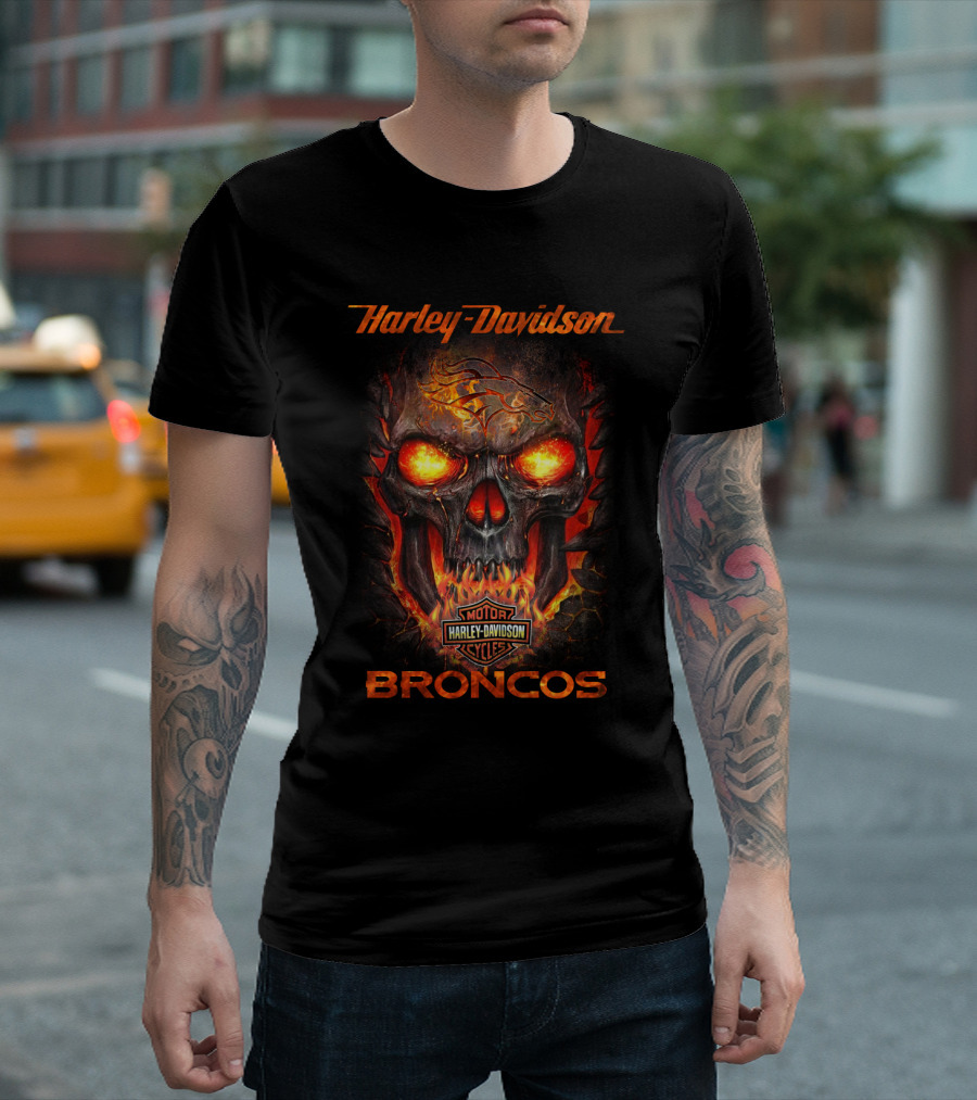 Harley Davidson Denver Broncos Motorcycles Fiery Skull T-Shirt