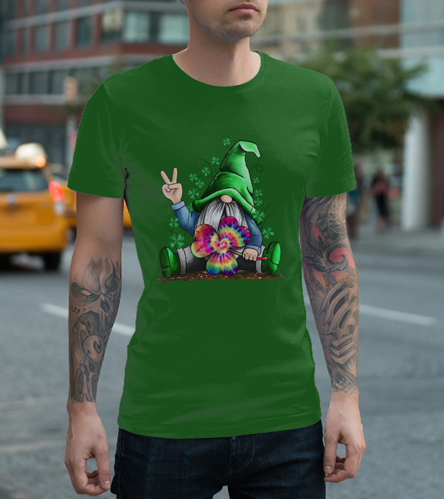 Hippie Gnome Irish With Tie-Dye Shamrock And Peace Sign T-Shirt