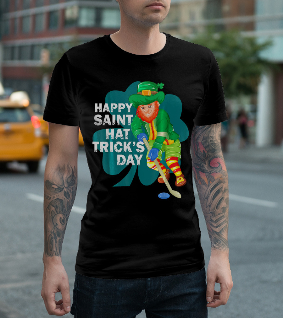Happy Saint Hat Trick's Day Leprechaun Hockey Player Shamrock Ice T-Shirt