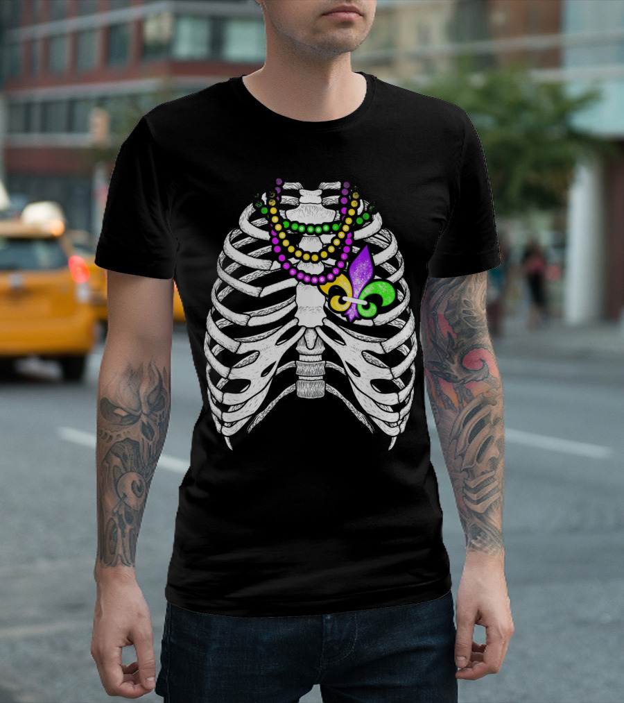 Mardi Gras Beads Skeleton Fleur De Lis Ribcage Heart T-Shirt