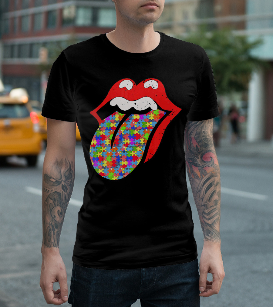 Red Lips Tongue Icon With Colorful Autism Awareness Puzzle Piece T-Shirt