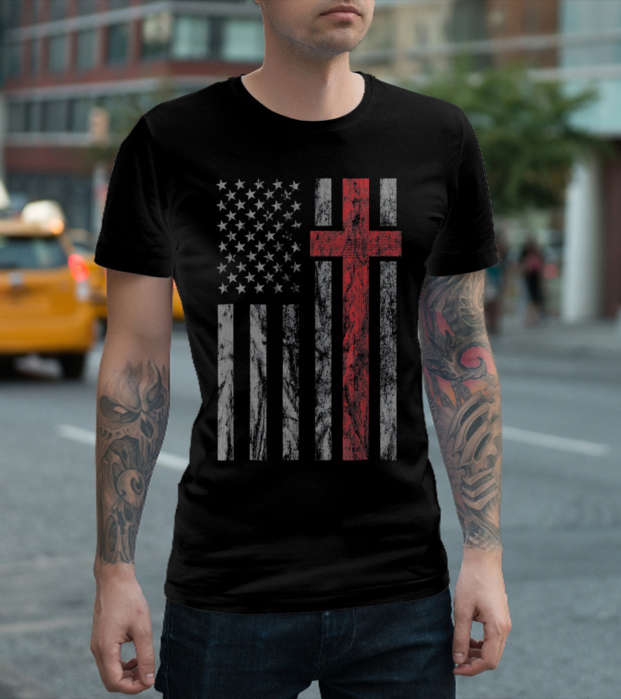 Vintage Distressed USA Flag With Red Christian Cross T-Shirt