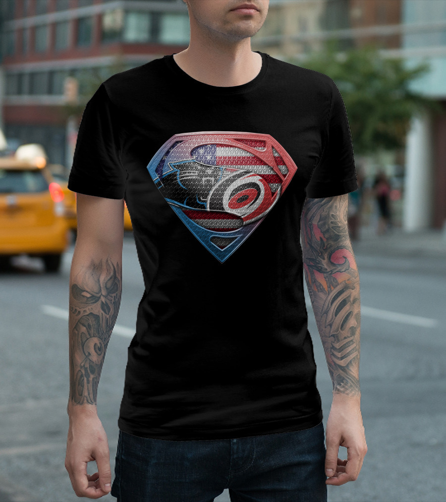 Carolina Panthers And Hurricanes Superman Shield Usa Flag Combination T-Shirt