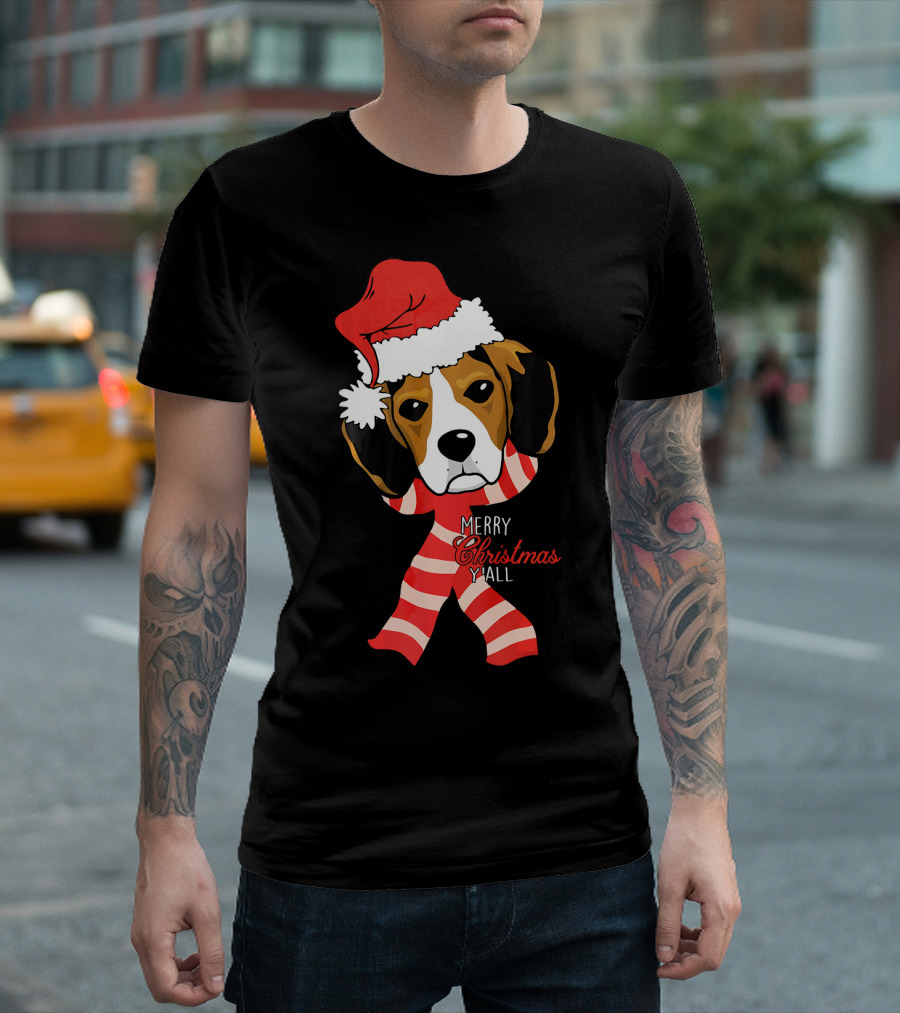 Merry Christmas Y'all Beagle Dog In Santa Hat And Striped Pajamas T-Shirt