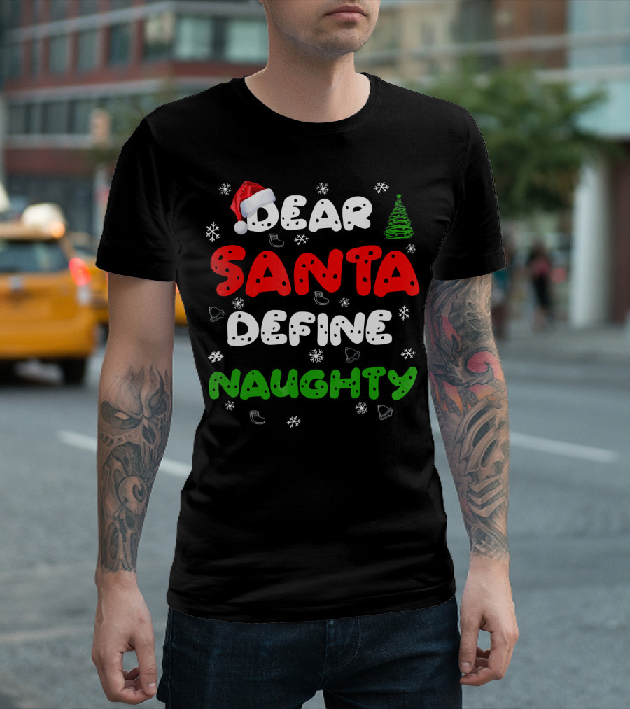 Dear Santa Define Naughty Christmas Hat Snowflakes Green Tree T-Shirt