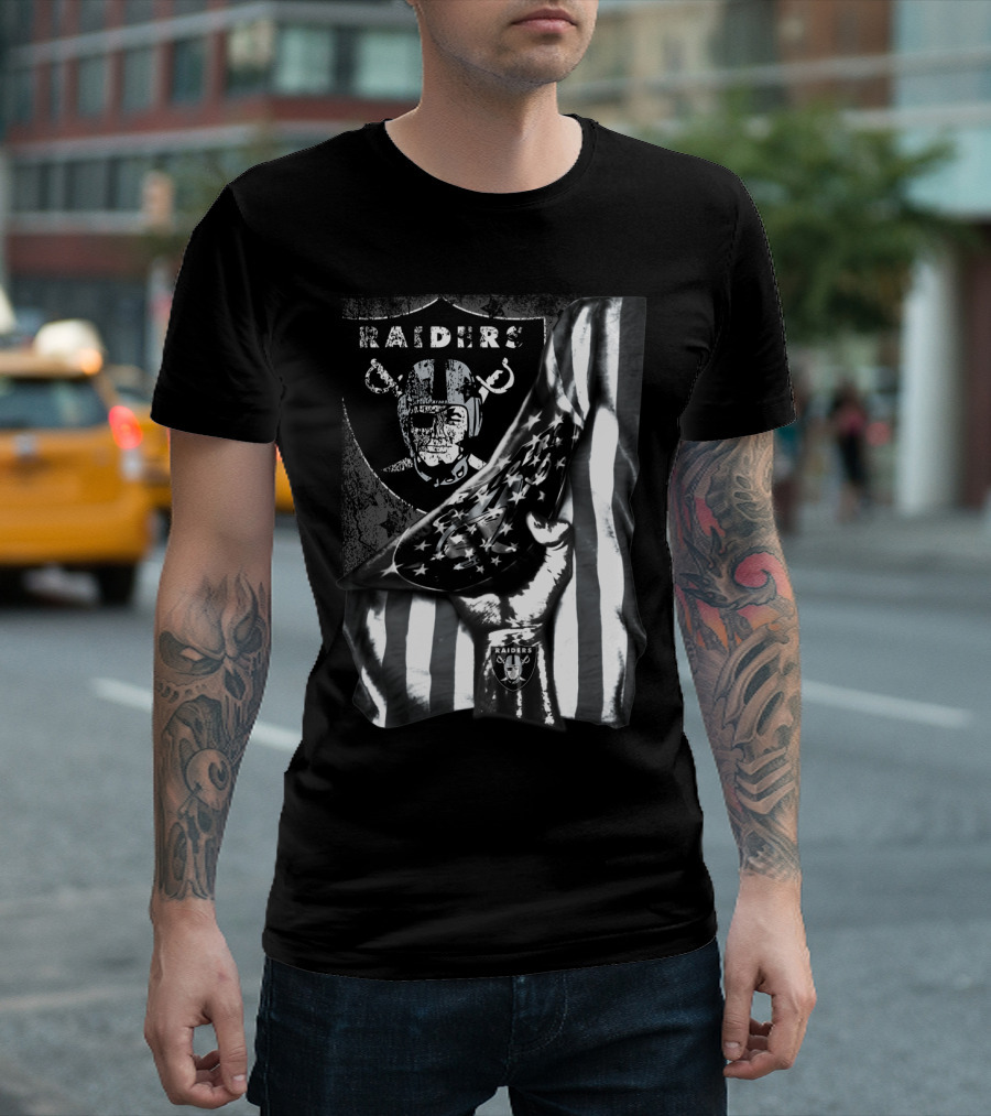 Raiders Shield Helmet And Stars Stripes Black And White Tribute T-Shirt
