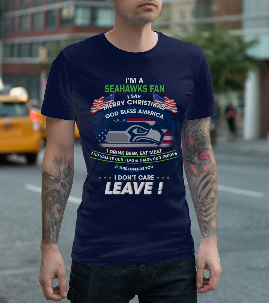 I'm A Seahawks Fan Merry Christmas God Bless America Drink Beer Eat Meat Salute Our Flag Thank Our Troops If This Offends You I Don't Care Leave T-Shirt